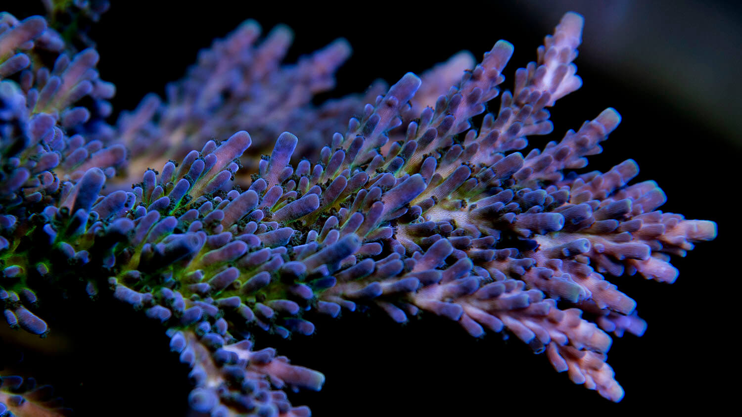 Like all torts, Myagi tort is a very special coral. with contrasting green and dark purple with thick polyps it is a very unique coral that adds color and character to a tank. it grows in branching form but with years branches can fuse and form a table with many layers.