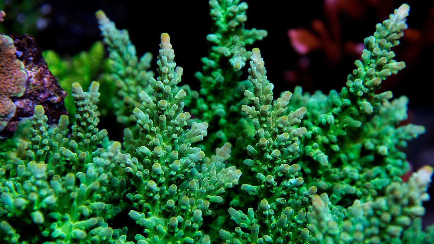 Bright green acropora with yellowish tips. grows in branches that fuse and form plates. giving it a nice tabling like shape as colony grows.